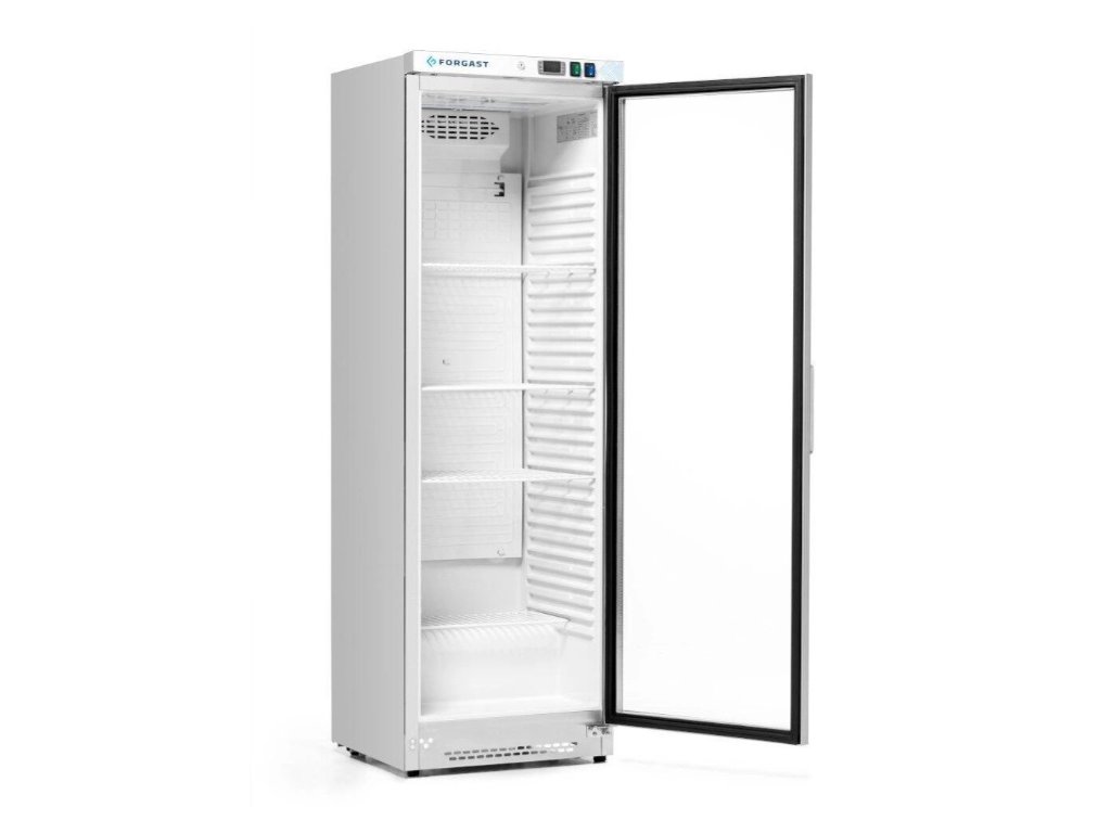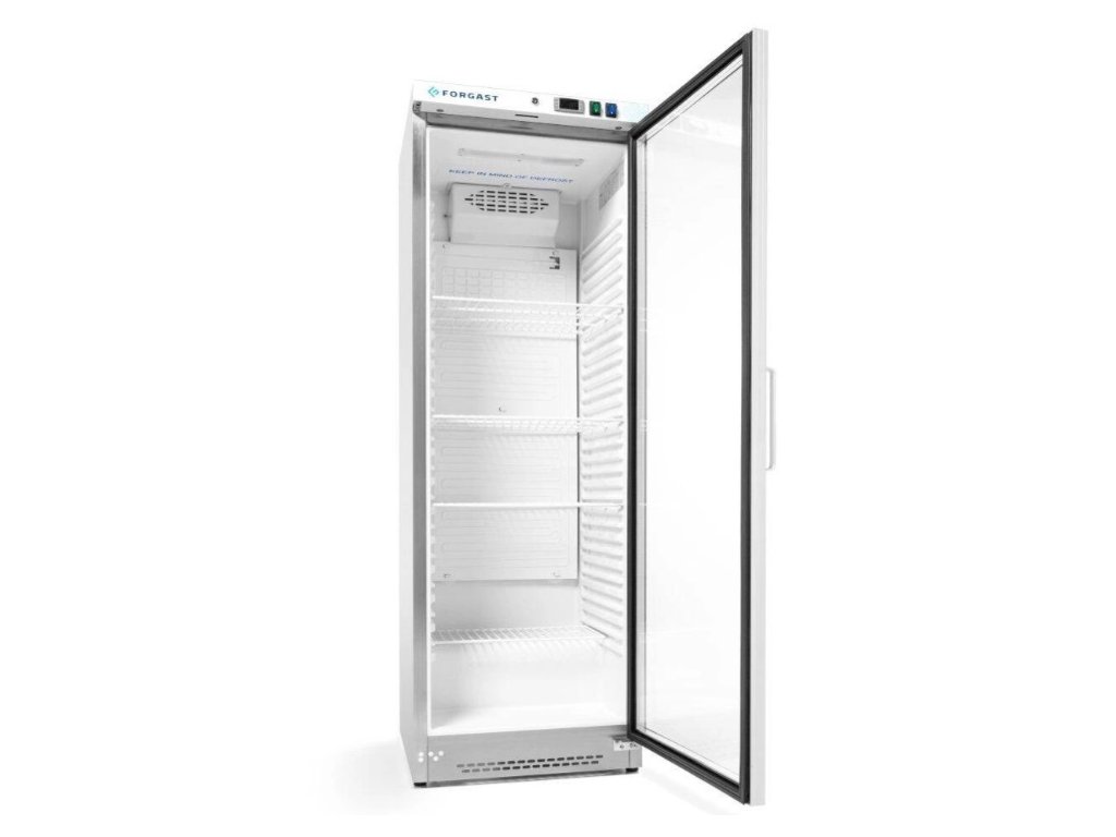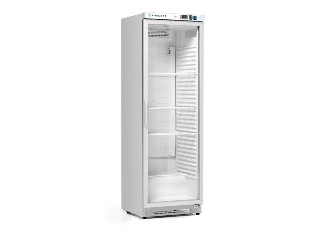 Chladicí skříň s prosklenými dveřmi značky Forgast o objemu 360 l, vyrobená z nerezové oceli, navržená pro uchovávání potravin v chladicích podmínkách v profesionálních kuchyních, restauracích a prodejních místech.