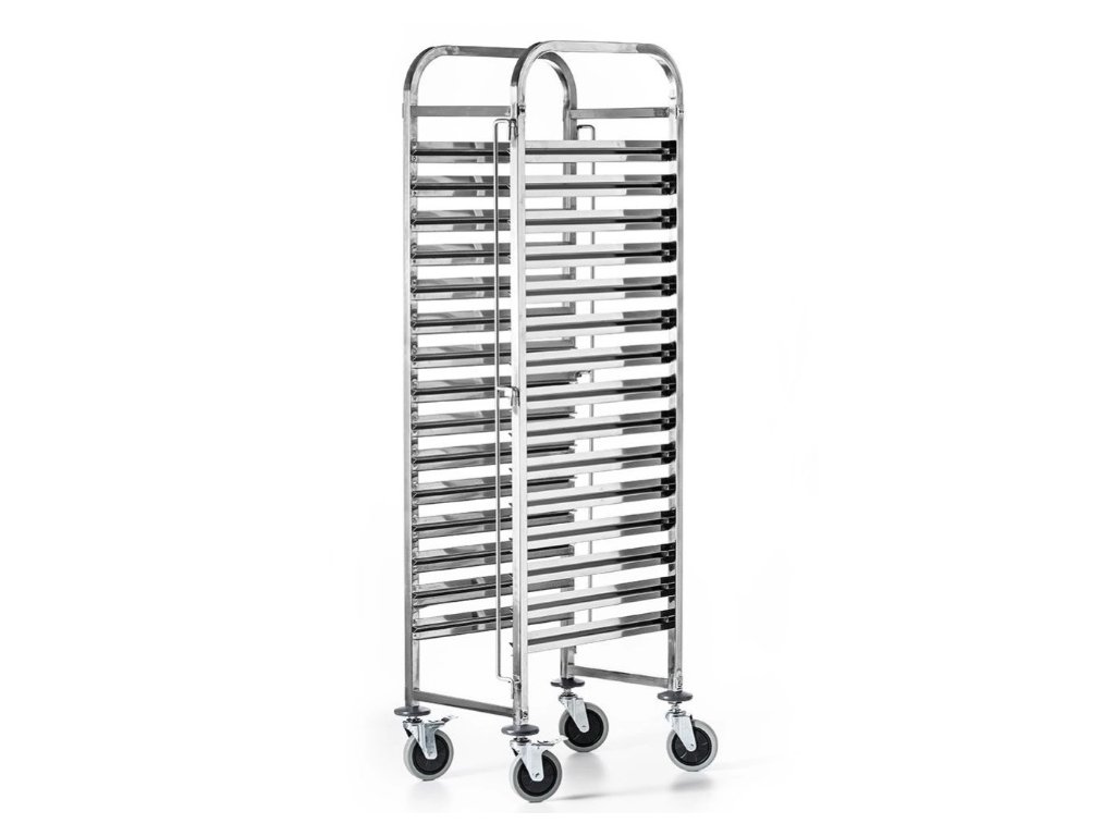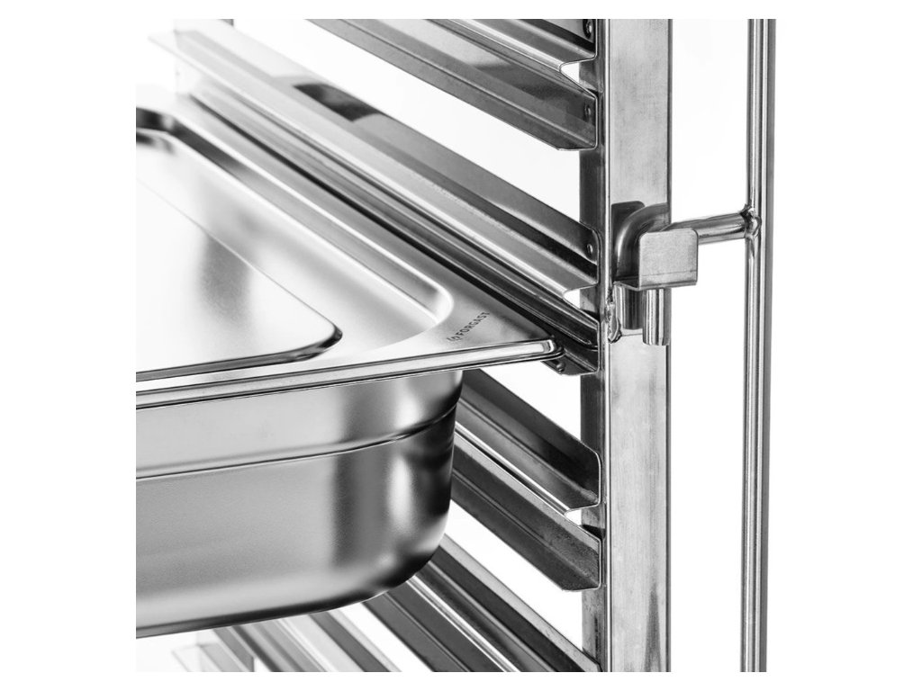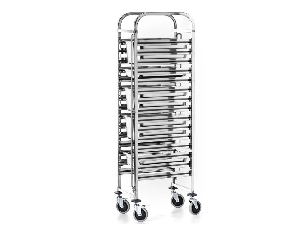 Kapacita: 15 GN 1/1 nádob – umožňuje současný transport velkého množství nádob, což výrazně zvyšuje efektivitu práce v kuchyni.