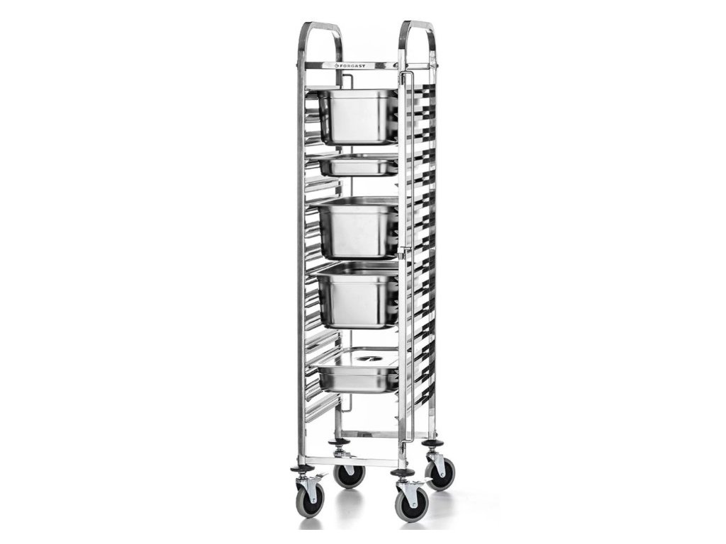 Skládací nerezový vozík na přepravu GN nádob FORGAST FG01101 je praktické a robustní řešení pro profesionální kuchyně, jídelny nebo cateringové firmy.