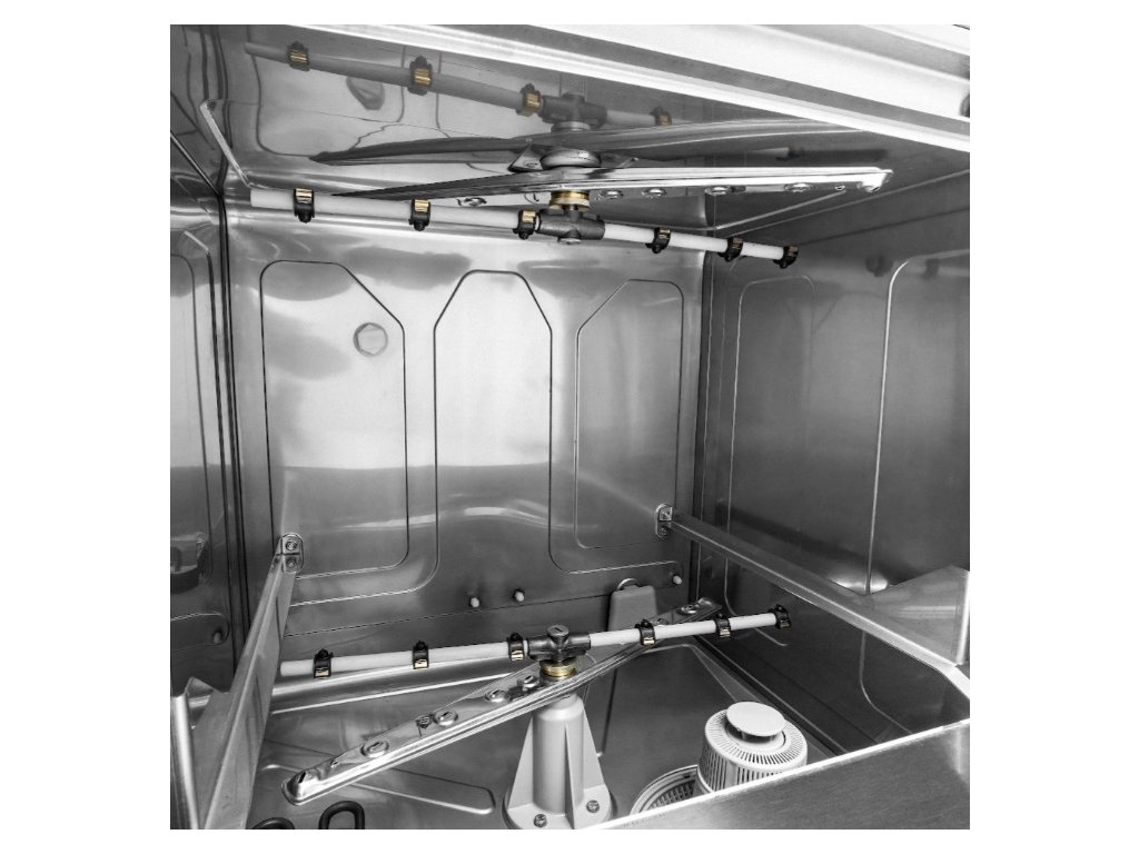 Zařízení je vybaveno spodními a horními mycími i oplachovacími rameny, které zaručují rovnoměrné a účinné čištění veškerého nádobí bez ohledu na jeho rozmístění v koši. Vestavěné odtokové čerpadlo umožňuje instalaci i na místech, kde je odtok vody nad úrovní podlahy, což je běžná situace v profesionálních kuchyních.