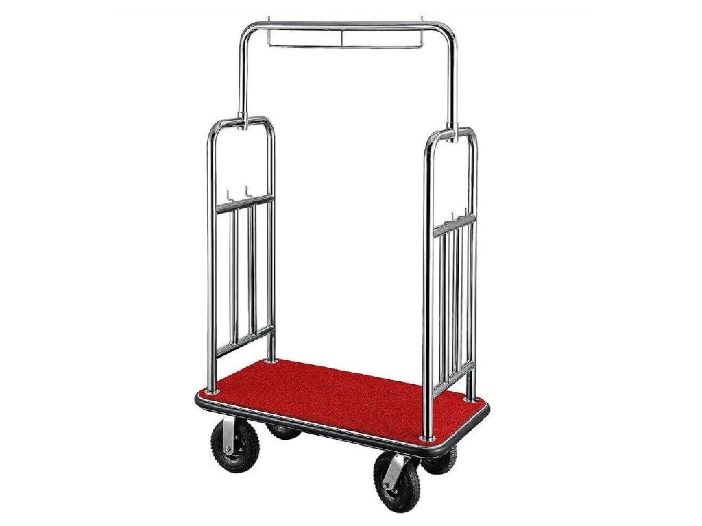 Vozík na zavazadla z nerezové oceli na kolečkách o průměru 200 mm s gumovými nárazníky a červeně lemovanou přepravní plochou.