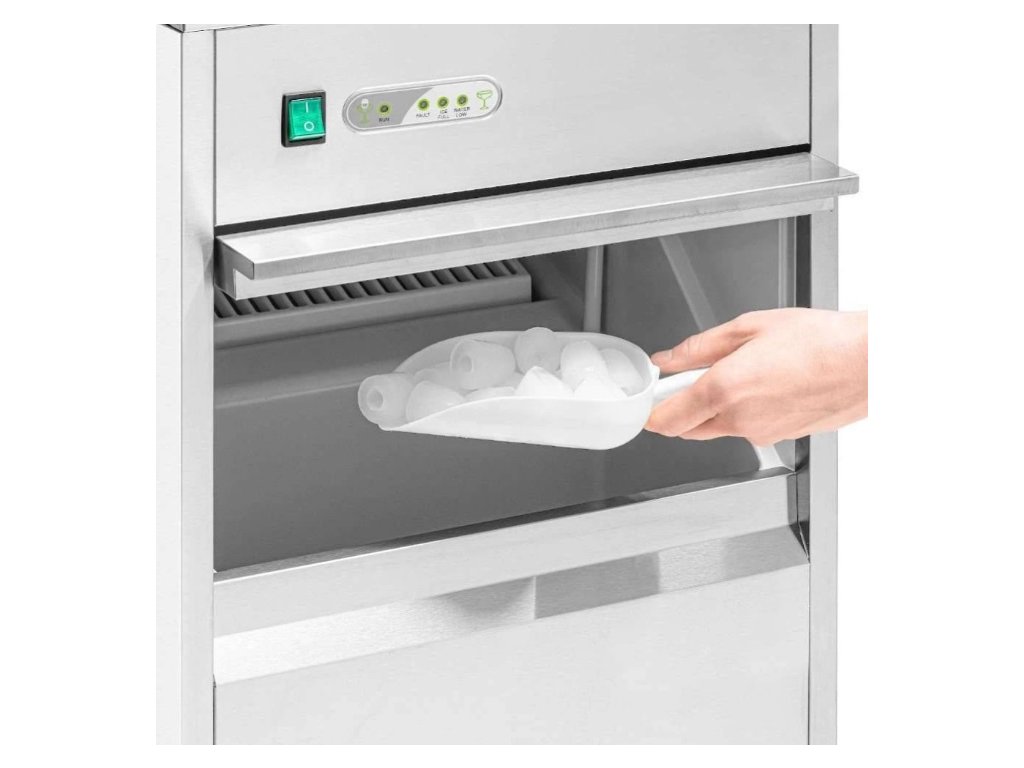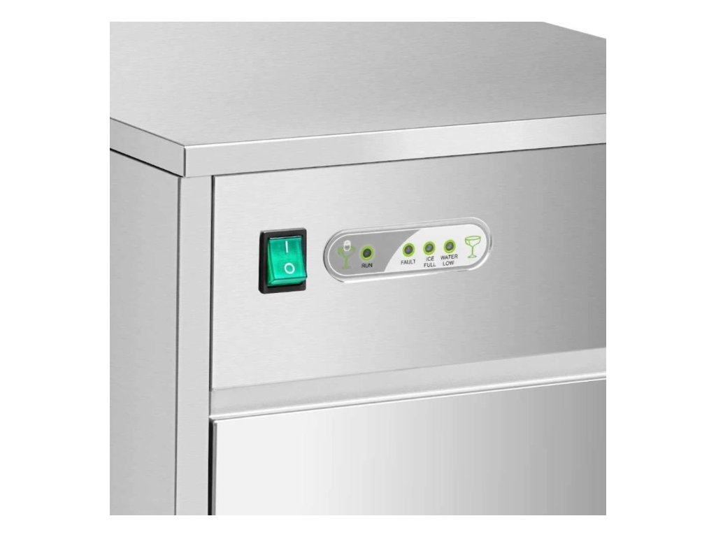 Výrobník kostek ledu má jednoduchý systém ovládání založený na ručním spínači a informačním panelu s ukazateli provozu, chyby, naplnění zásobníku na kostky ledu a nedostatku vody.