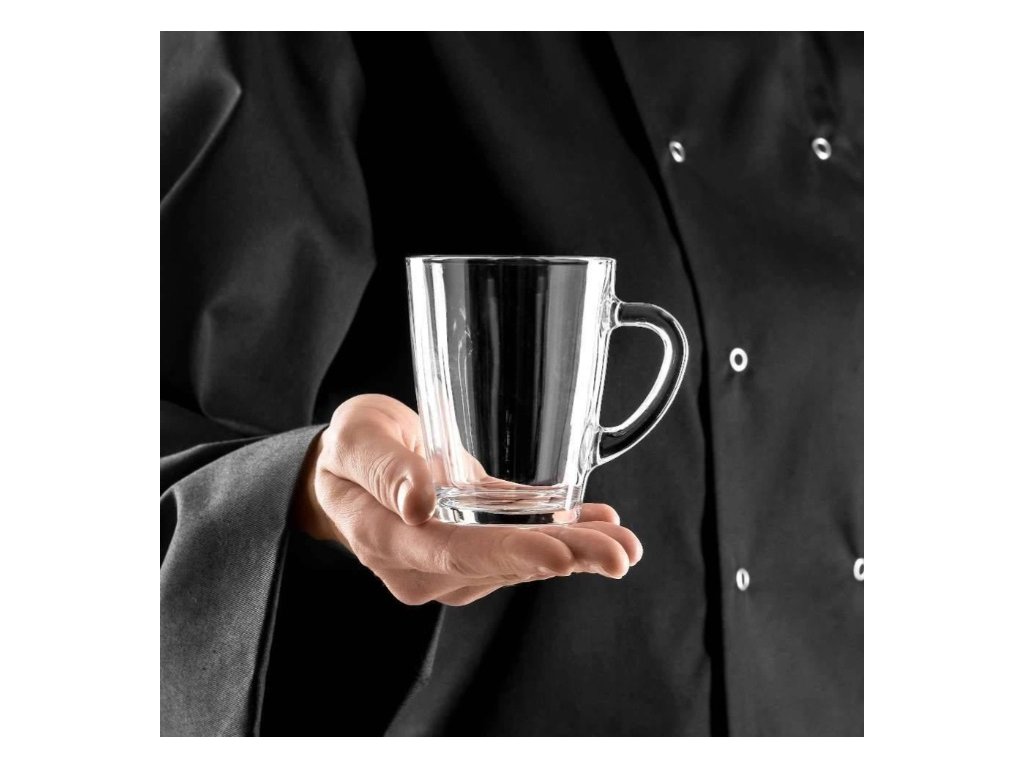 Hrnek ze skla s vysokou odolností proti rozbití, otlučení a tepelnému šoku.